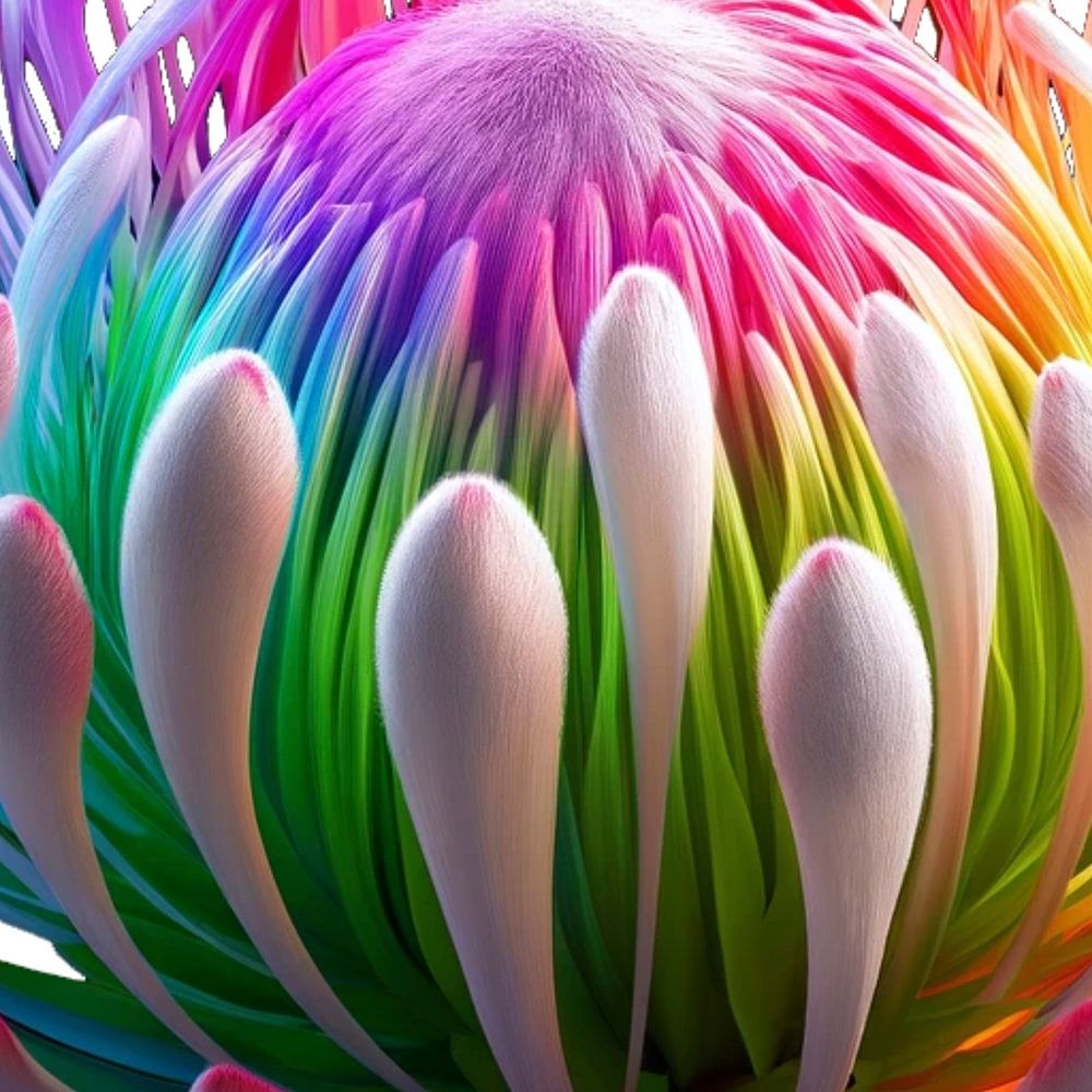 The uploaded image shows a colourful, artistically depicted protea flower. With its bright rainbow colours and finely detailed petals, this image is an impressive example of modern digital art. The protea, also known as the sugarbush, is one of the oldest flowering plants and symbolises change and diversity.