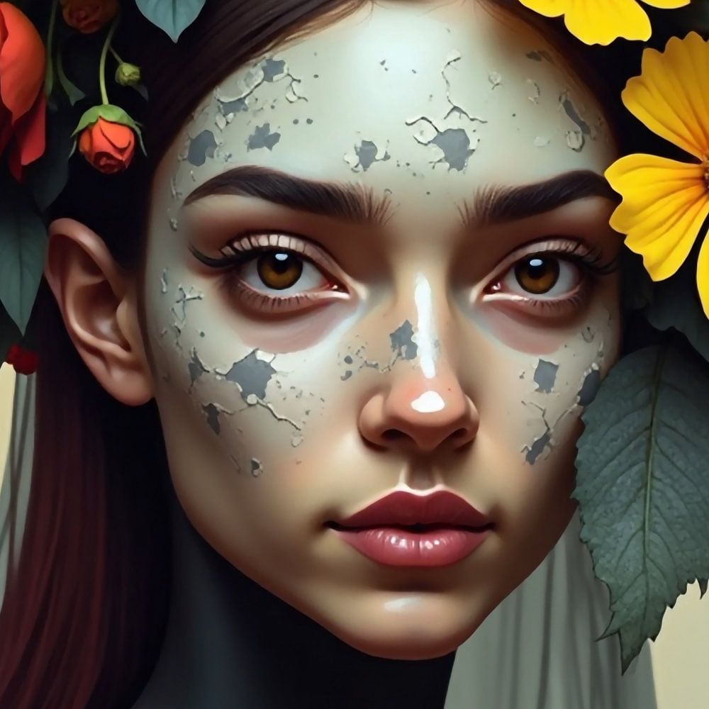 This painting brings together the beauty of nature and human expression in an enchanting work of art. A graceful woman's face is enveloped by an abundance of flowers, with warm yellow and red tones and soft petals evoking a sense of elegance and sophistication. The combination of artistic floral details and deep colours makes this painting perfect for an interior that exudes nature, warmth and romance.