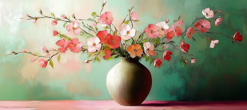 Flower Vase - This flower painting depicts a round earthenware vase with fanning branches full of loose pink and red flowers in an impasto, modern still life against a soft green background and works ideally as a flower painting, painting flowers or painting for above the sofa in a modern interior.