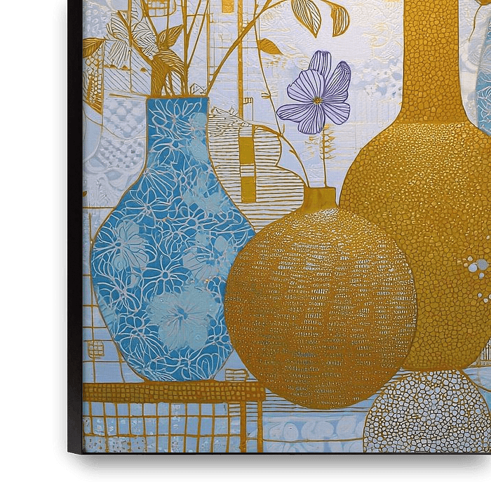 Details: flowers, vases, lilac, gold, modern art, still life, colourful, interior, decoration,…