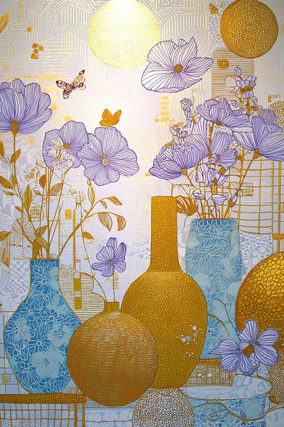 Flower Vases | Floral Glow - This modern still life painting depicts colourful flowers in vases with golden details and an airy design, where the combination of soft lilac and golden tones creates a striking visual effect.