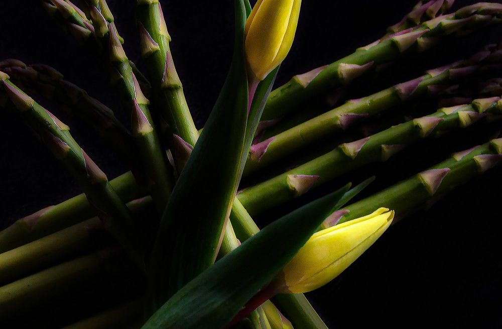 Flower arrangement with yellow tulips and green asparagus on a black background. A still life.