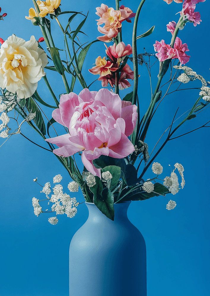 Beautiful colourful flower bouquet in blue vase on blue background exudes tranquillity and elegance. A beautiful minimalist still life.
