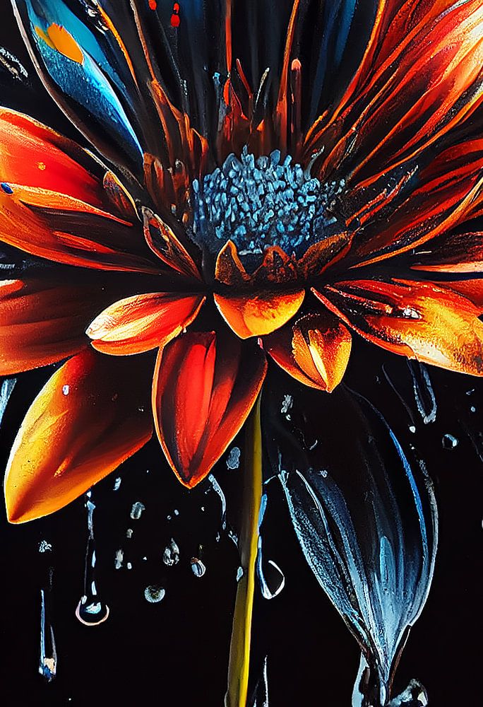 A gorgeous flower, acrylic paint, water and an unknown element called Floetrol. The lighting is always different. Paint spatters off. The elements mentioned above are all in 1 sentence and are assembled by the Ai bot from noise into different images (all of which can be found here). It's mainly the playfulness and lighting that attract me myself, so I myself have two, including this one hanging on the wall against grey stone job between army green strips.