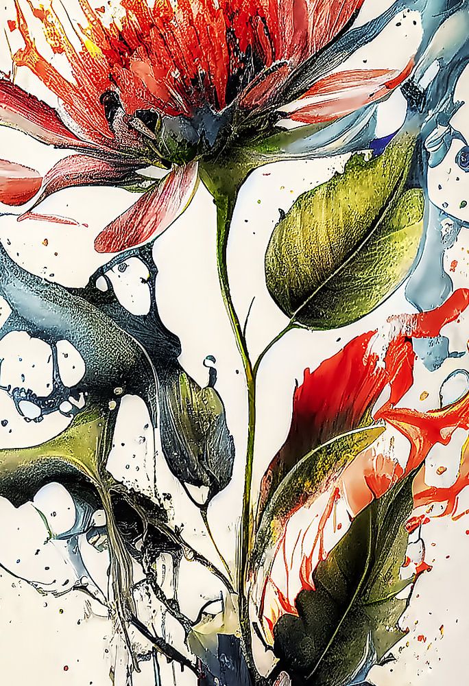 In the previous series, I did the basic generation in Ai with a black background, but of course there are many viewers who lean more towards the light side. That's why I also made a series with a light background.The best thing is that the Ai bot with the light background also generates a totally different image, where the three basic elements are present, the flower, acrylic paint and water, but brings out a much larger image.It's the way the image is constructed and the slightly abstract output. It is not specific so it fits basically anywhere, which is also why I myself have two images from the dark series hanging on the wall on dark green with grey stone motif. The colours give the space that needed playfulness. So an Ai-art bot was used, which gets certain words and details entered from me and thus conjures four images out of noise. I then go into photographic editing software to make the necessary edits such as hdr, colour balance, sharpening, depth and contrast enhancements. After that, I need to enlarge the base image.