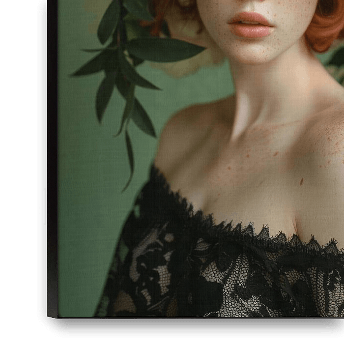 This fascinating portrait shows a young woman with red hair wearing a majestic crown of delicate, pastel-coloured blossoms. The harmony between the soft blossoms and her delicate freckles creates a fairytale atmosphere. The artful composition of floral elements and natural beauty features makes this work a real eye-catcher for lovers of…