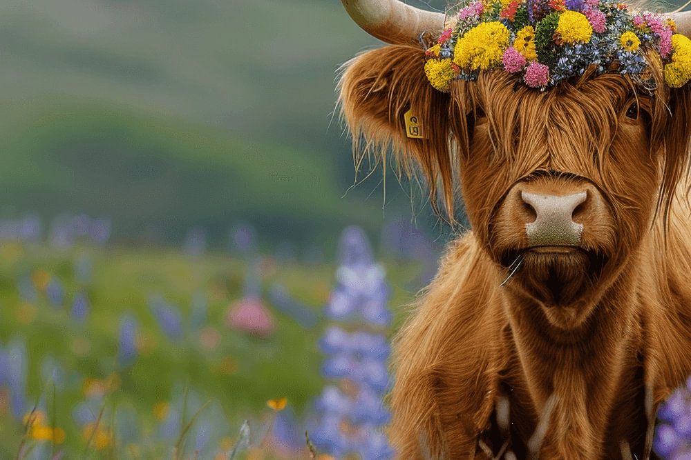 Discover the heart of nature with this enchanting photograph of a Highland cattle, crowned with a vibrant flower crown, surrounded by a sea of wild flowers. This photograph captures an unforgettable moment of tranquillity and beauty, bringing the peaceful essence of the Scottish Highlands right into your home. Perfect for lovers of country idylls and natural elegance, this work is a tribute to the unspoilt beauty of nature and a tribute to the majestic presence of these unique animals. Be inspired by this work of art and bring a piece of serene nature into your home.