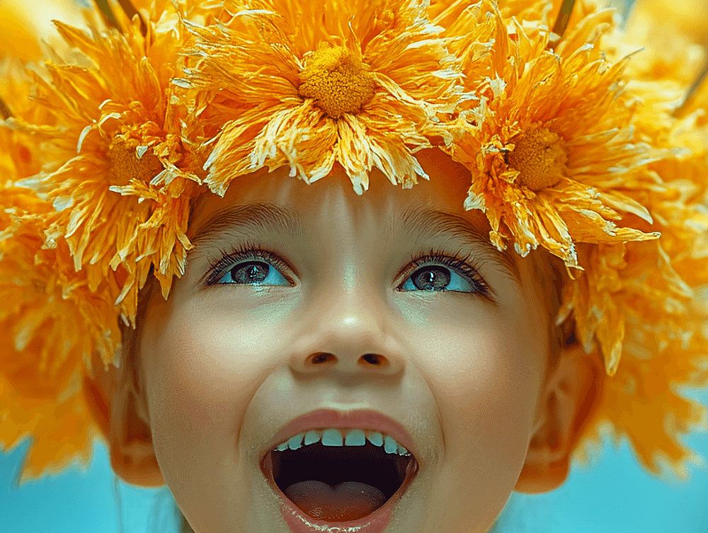 Child with tulip headdress smiles in amazement - colourful fashion photography with surreal look