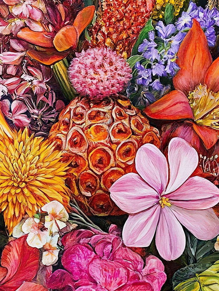 Details: flower painting, tropical flowers, botanical art, colourful flora, hibiscus, pineapple, lilies, art painting, floral art, nature art