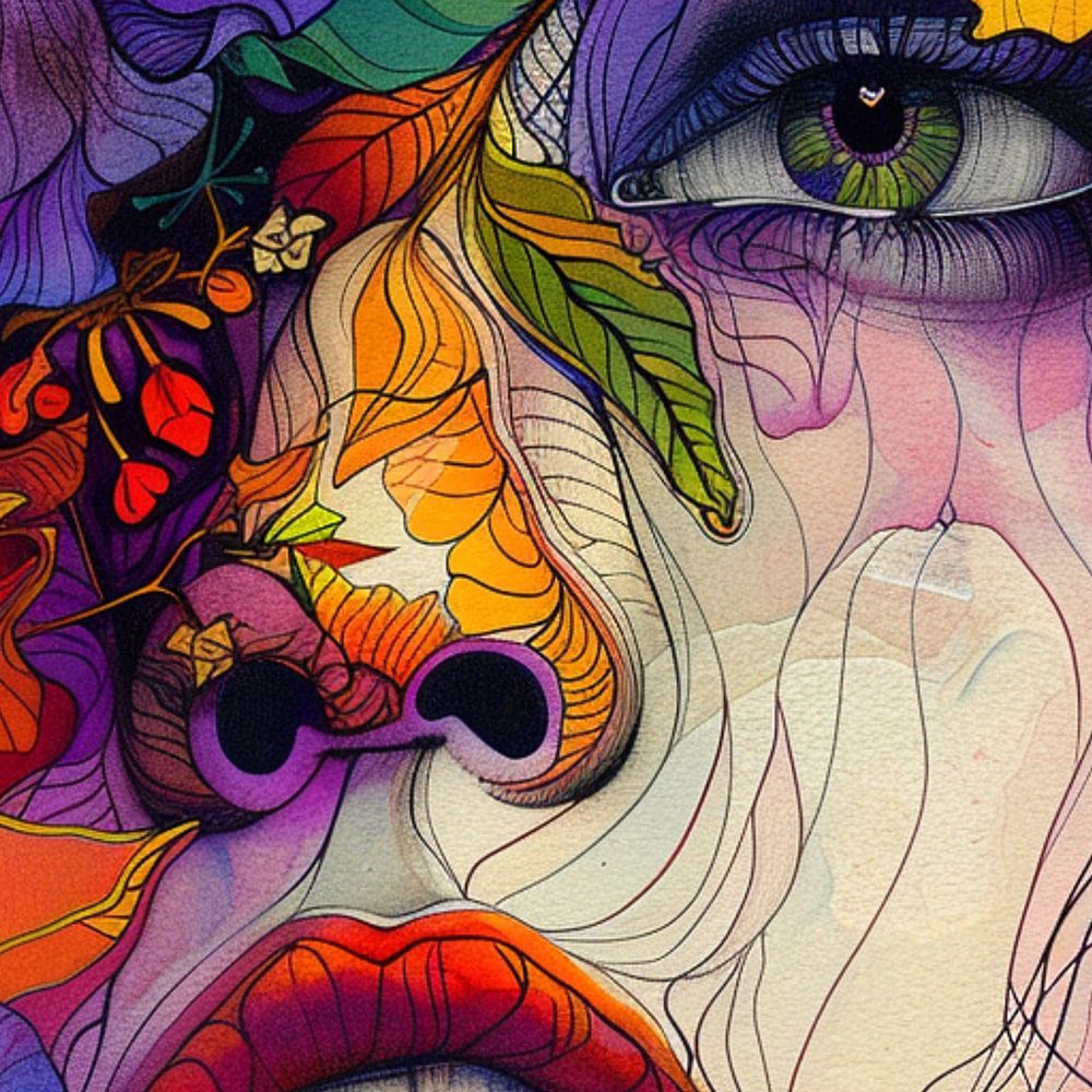 An enchanting digital creation depicting a woman, completely fused with a lush sea of flowers. Her hair flows like a cascade of petals, each leaf a different shade, ranging from deep purple to radiant yellow. Her eyes radiate the vibrant colours of nature, as if she is holding the beauty and life force of flowers. The woman seems to breathe in harmony with the flora around her, where every movement is a subtle dance celebrating nature. This symbiosis of man and flora creates a vision of perfection, where the boundaries between the human and natural worlds blur. The Flower Woman is not just an image, but a living ode to the beauty and power of nature, reminding us of our connection to the earth.