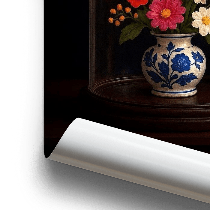 A burst of colour and vitality - orange poppies, red carnations and purple accents dance together in a Delft vase. This composition captures the warmth of a summer day in a timeless still life full of energy.