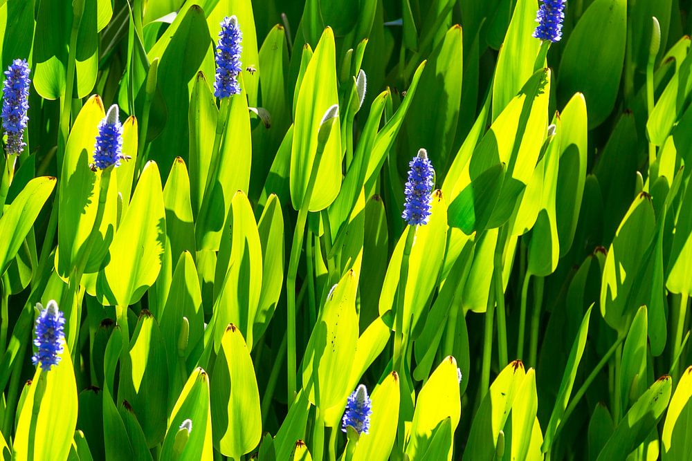 A flower bed of flowering swamp hyacinths (Pontederia cordata) in a sunny environment.