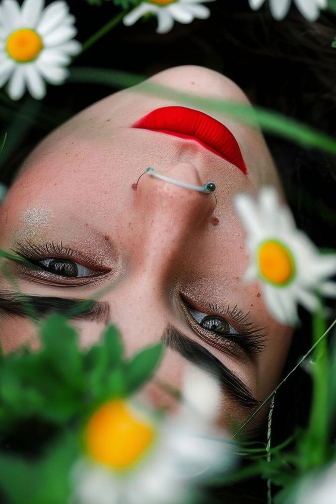 In the midst of a colourful splendour of flowers, the picture looks like a dream from nature. The young woman is lying with her head in a meadow full of daisies, her bright red lips and piercing contrasting with the green surroundings. Her eyes reflect a deep calm and connection with nature, while gentle plays of light decorate the scenery.