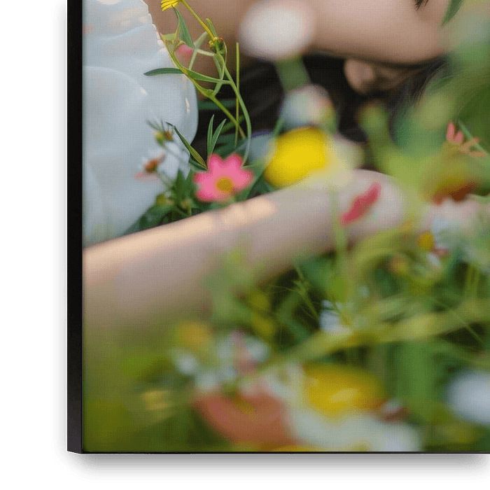 The picture shows a person lying relaxed in the middle of a colourful field of flowers. Her gentle facial features and natural expression create a peaceful atmosphere. The vibrant colours of the flowers frame her artfully and emphasise the harmony between man and nature, while the soft light creates a dreamlike mood.