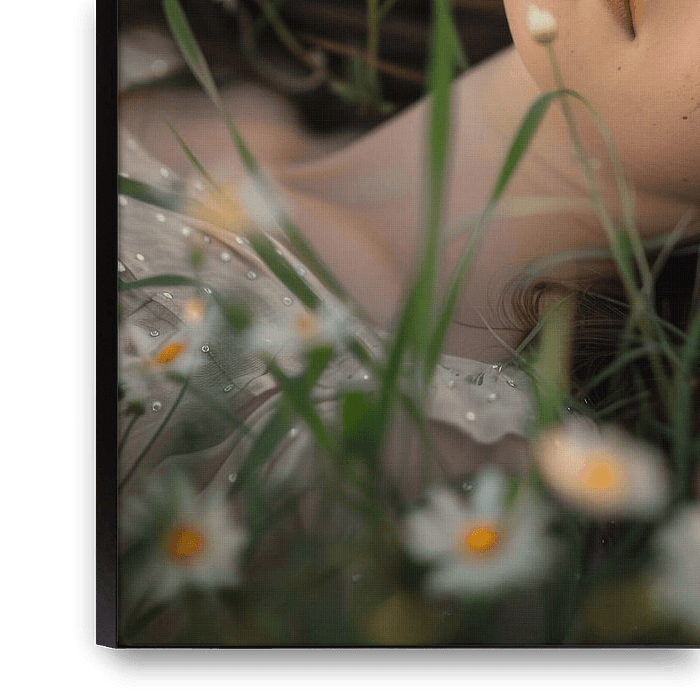 The picture shows a dreamy portrait of a young woman lying gently in the grass, surrounded by delicate daisies. Her radiant eyes and natural complexion, emphasised by a hint of freckles, create a harmonious connection to nature. The soft lighting lends the scene a romantic, almost magical flair.