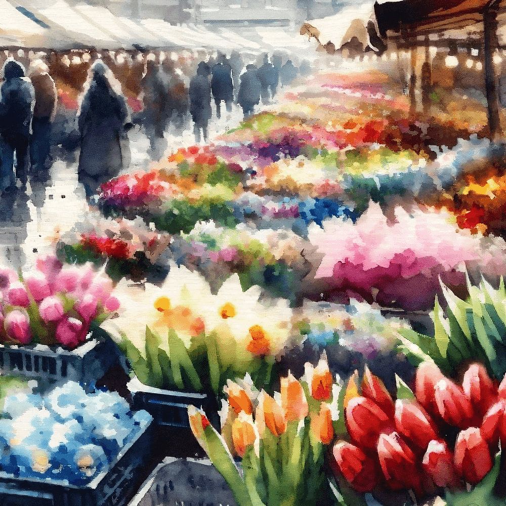In this vibrant market scene, captured in a beautiful watercolour painting, the essence of a thriving flower market in Amsterdam comes alive. The air is filled with the promise of an early morning, as the first rays of sunlight illuminate the historic facades of Dutch merchant houses. Visitors stroll leisurely between the displays, which are abundantly filled with a rainbow of tulips - from deep red to soft yellow and bright orange. The reflection of the light on the wet vowels suggests a recently passed rainstorm, further saturating the colours. This artwork exudes the atmosphere of a fresh new day and promises the beauty of simple pleasures. Perfect for those who want to bring a touch of Dutch charm to their space, or as a gift for lovers of flowers and travel.