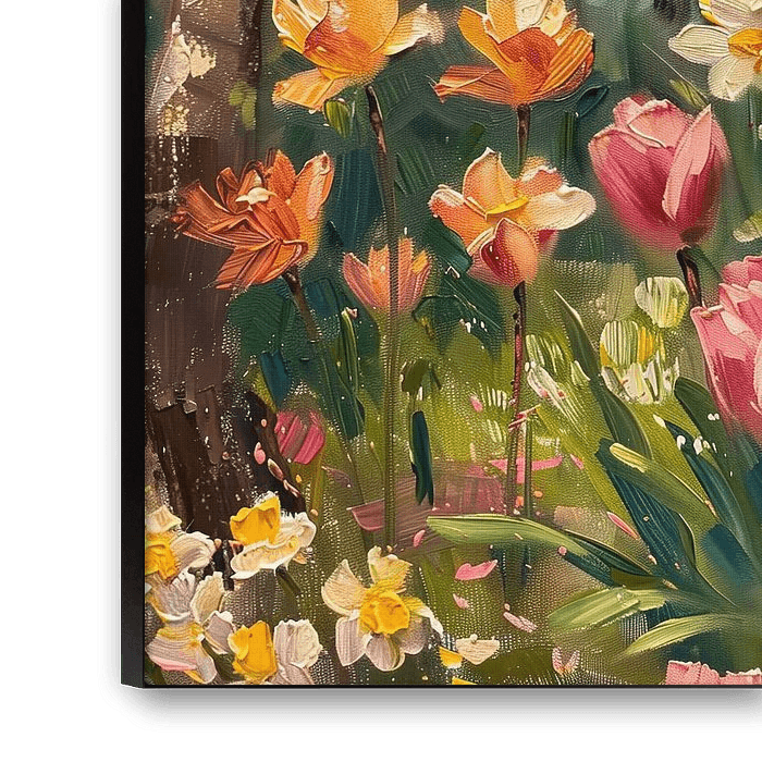 Flower painting | Flower garden - This flower painting shows colourful tulips and daffodils surrounded by a beautiful flowering tree with pink leaves, giving a cheerful and fresh atmosphere for the garden.