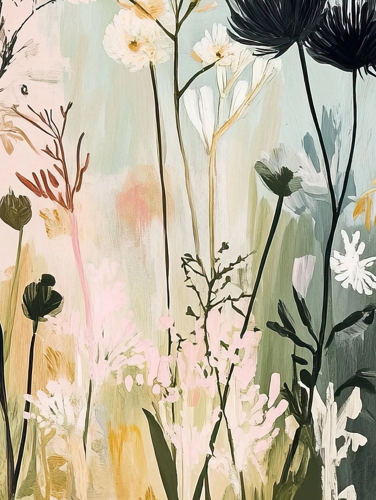 Flower painting | Garden of Silence - This flower painting shows a collection of stylised flowers in various shapes and colours, elegantly rendered against a softly coloured background with impressionist influences.
