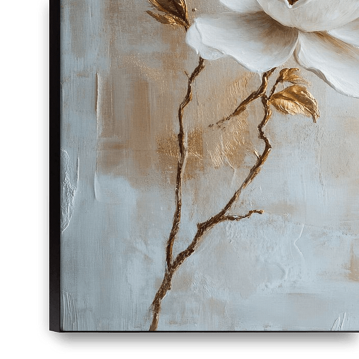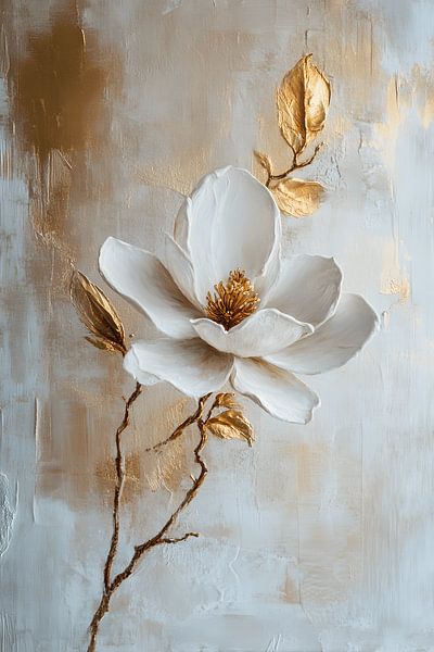 A painting of a white flower on a gold background.