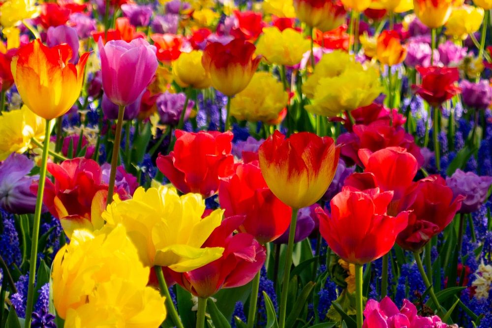 A flowerbed full of colourful tulips and blue grapes is shining in the sun. The border is richly filled with them and complements the green grass and the green hedge next to it. A pleasure for the eye.