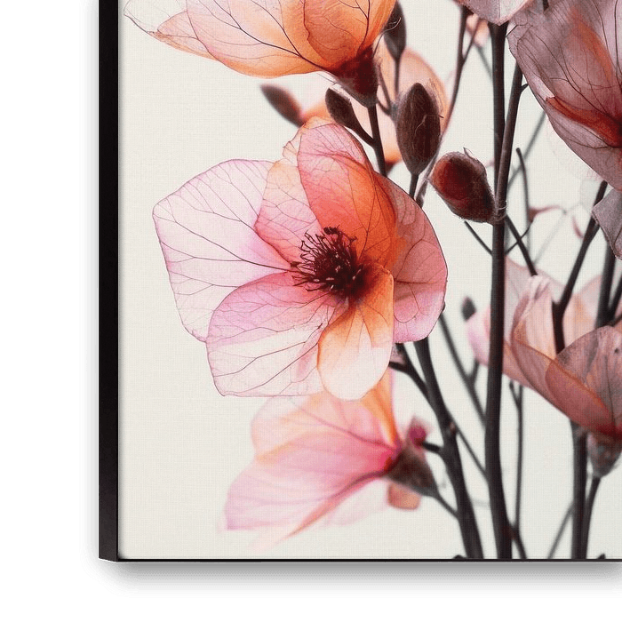 This picture shows a delicate bouquet of translucent flowers in soft shades of pink and orange. The delicate petals appear almost transparent, emphasising the fine veins of the leaves. The flowers shimmer in a harmonious colour gradient from soft pink tones to warm orange, giving them a dreamy lightness. The darker stems and buds form a wonderful contrast to the light-coloured flowers and create a balance between fragility and strength.