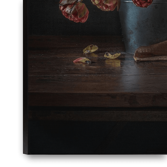 Do you see it too? A creation in which the dark wood table has an illumination that makes the flowers in a bucket look extra beautiful.