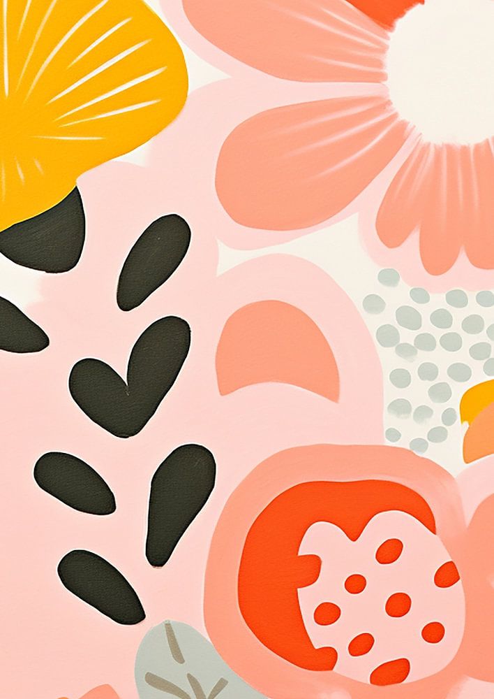 A giclee art print of flowers, in the style of wavy lines and organic shapes, with pale pink and orange tones. It displays indigenous motifs and shows influences of Gary Hume, Australian landscapes, cellular structures, and a colour palette inspired by earth tones.