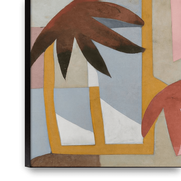 This fascinating print shows a mix of earth tones and geometric shapes, with stylised leaves in rich reds and browns. The interplay of warm colours and soft pastels creates a serene yet dynamic composition, perfect for bringing a touch of modern elegance and natural beauty to any interior.