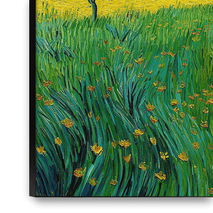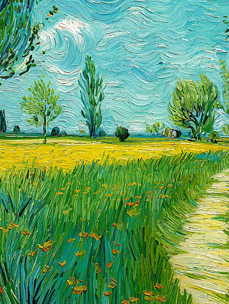 Dieses bezaubernde Artwork fängt die idyllische Schönheit eines Feldweges im Frühsommer im unverwechselbaren Stil von Vincent van Gogh ein und zeigt einen einladenden Pfad, der durch blühende Wiesen und Felder führt. In der charakteristischen Impasto-Technik des niederländischen Meisters gemalt, zeichnet sich das Werk durch dick…