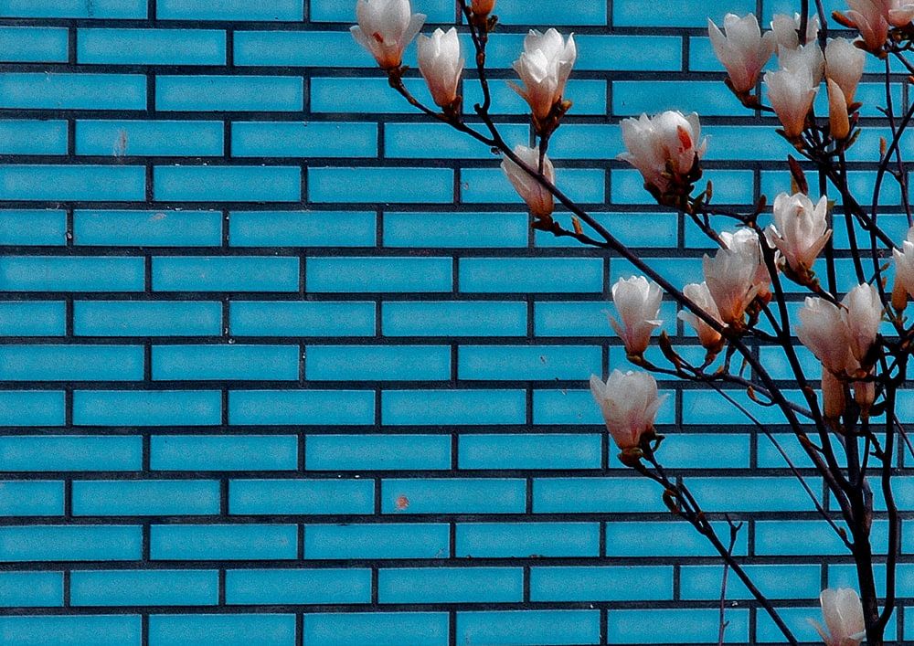 Every time I passed it, I was surprised by the beauty of flowering magnolia in front of a blue brick wall. Beginning of spring captured in a graphic image.