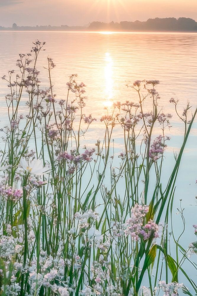 A gentle morning sky unfolds over a glistening body of water as the sun slowly rises, sending golden rays dancing across the gentle waves. Delicate flowers sway in the gentle breeze, framed by the calm surface of the water, reflecting the peace and beauty of nature. A true moment of harmony.
