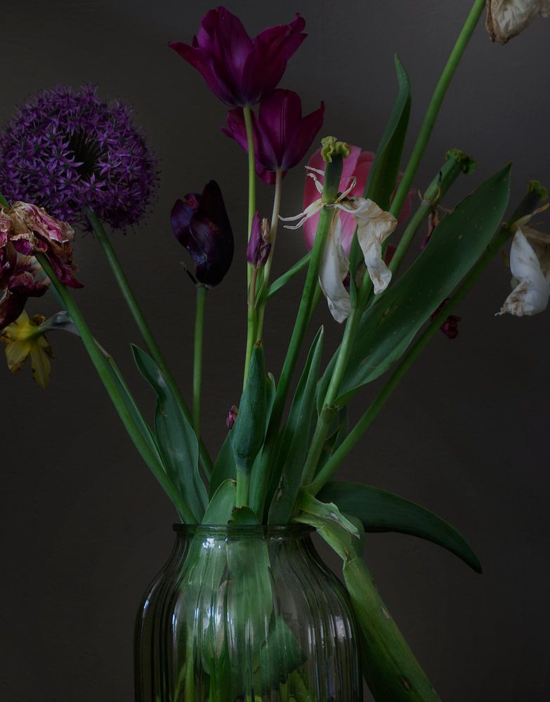 Moody still life of a vase of flowers that have had their best day. The picture is part of a series of 20 that will be made available on this site during 2023.