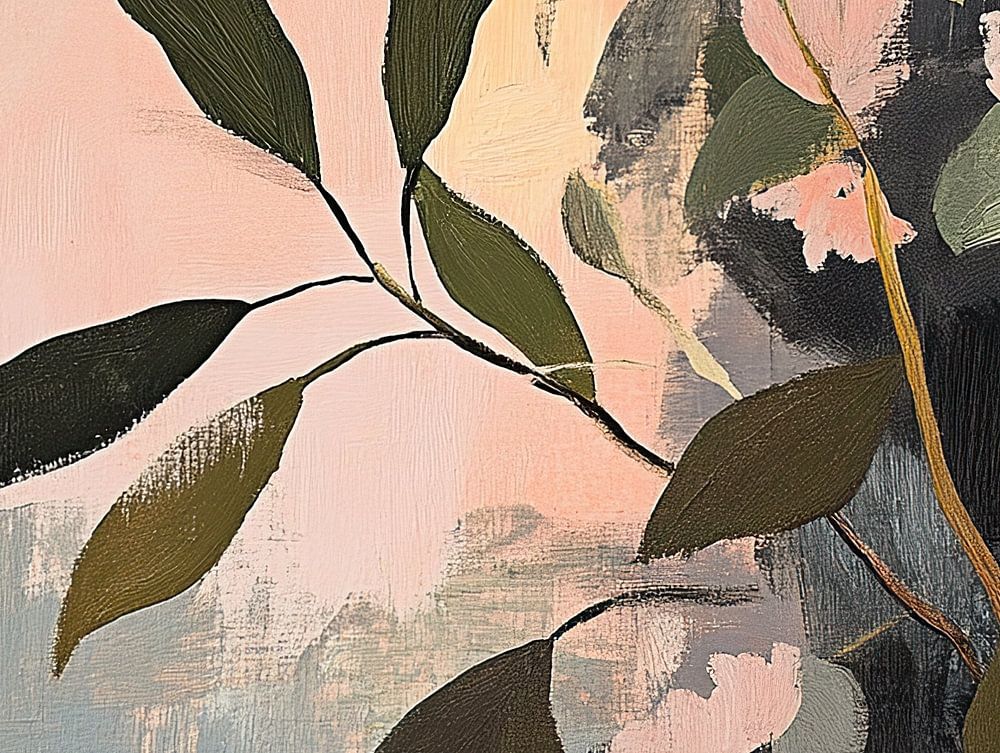 Flowers Black Pink | Soft Petals Edge - This floral painting depicts an elegant composition of delicate white flowers with lush green leaves, on a background that melds soft pink into deep black.