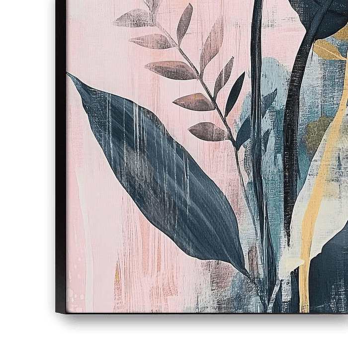 Flowers | Blossom Serenade - This floral painting depicts an elegant arrangement of various plants with large leaves and delicate blossoms, executed in a palette of soft pinks, deep blues and warm ochre tones, layered with dynamic brushstrokes that create a vibrant texture.