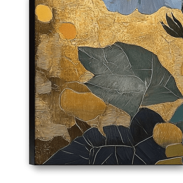 Flowers Gold | Vibrant Petal Symphony - This flower painting shows a group of brightly coloured, oversized flowers in various shades such as blue, white, orange and red against a gold-like background with abstractly shaped leaves and decorative elements.