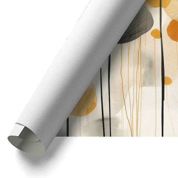 Abstract flowers bloom on long, mysterious black stems, rising like silhouettes against a background of soft white and subtle earth tones. The composition exudes a sense of elegance and subtlety, with the artist playing with the contrasts between the deep darkness of the stems and the light, airy background. The background of white and…