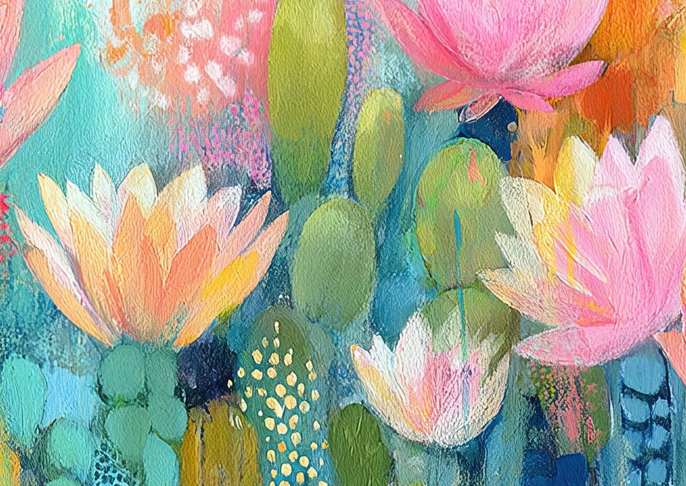 Flowers Water Lilies | Pink Flowers - In this flower painting, you will see large, colourful flowers such as pink and orange water lilies, which contrast cheerfully against a background of blue and green tones, giving a fresh and modern look to the artwork.