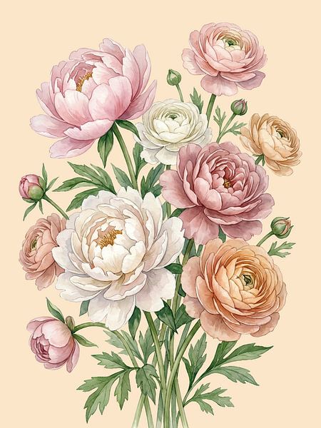 Buy this flower art Flowers Watercolour Vintage Peonies and Ranunculus by Max Steinwald on canvas, ArtFrame, poster and wallpaper, printed on demand in high quality.