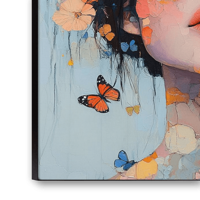 Details: women painting, flower painting, butterflies, modern art, portrait painting, floral portrait, summer mood, female portrait, colourful painting, reflections