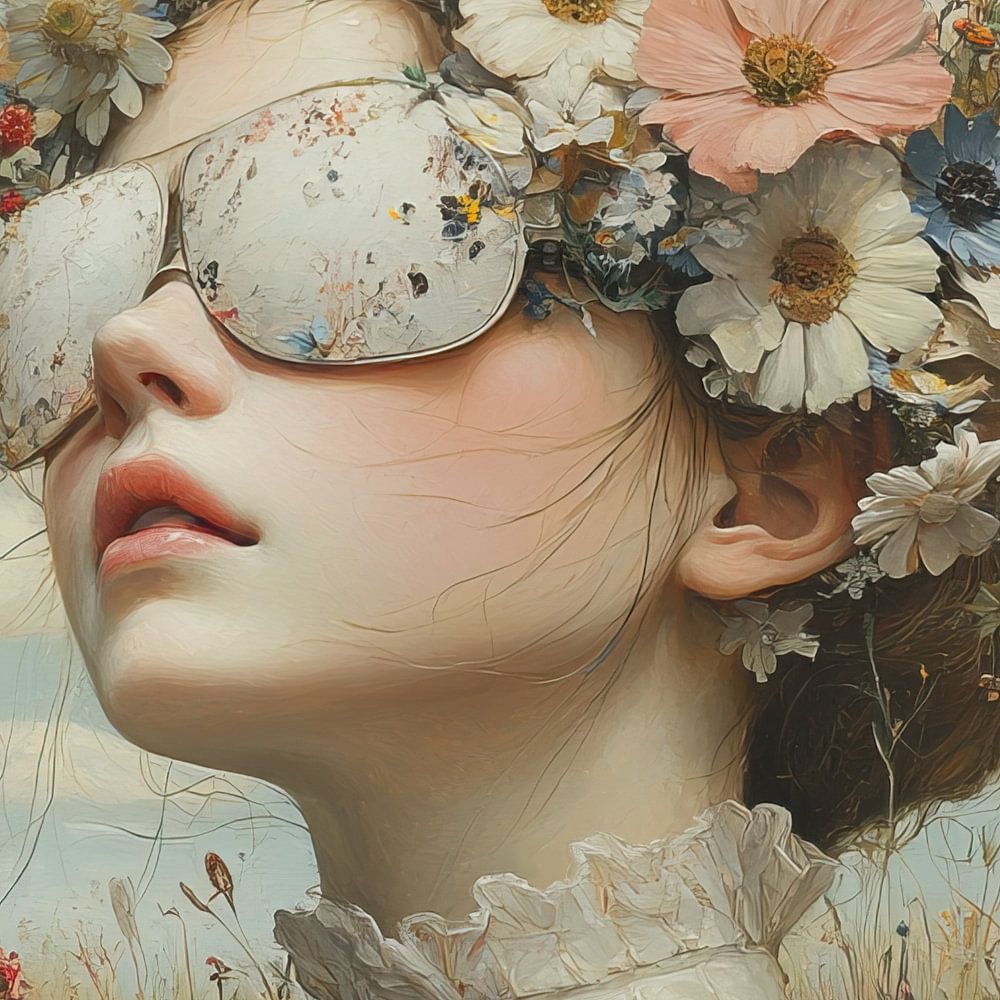 Flower Woman - This woman painting shows a young woman with a striking flower wreath on her head and butterflies fluttering around, against a background of a flowery field and a light, cloudy sky.