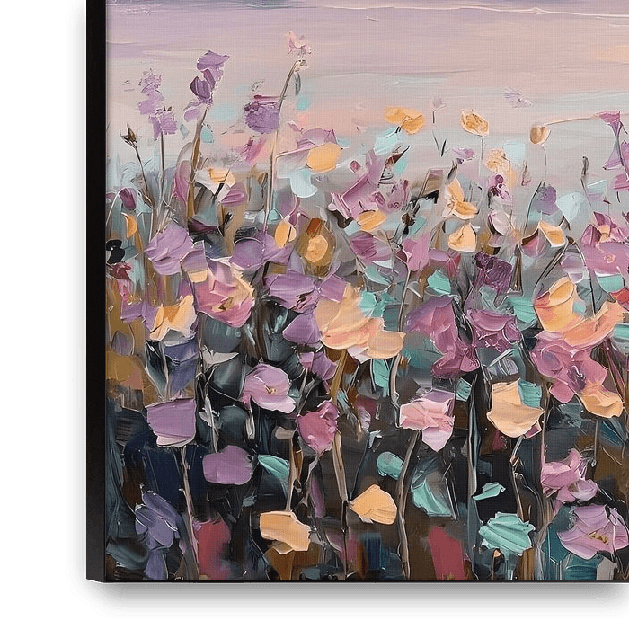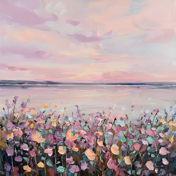 A vast field of flowers unfolds in soft pastel shades stretching all the way to the distant horizon. Shades of pale pink, lavender and peach blend harmoniously into one another. The water reflects these colours like a dreamy mirror of tranquillity. Flowers seem to float in a sea of soft hues.