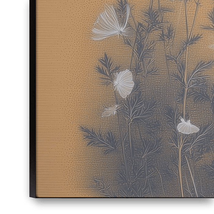A warm and light artwork in which delicate flowers softly light up against a golden background. The airy shapes and subtle lines give the image a peaceful flow, as if the flowers move with the silence. Timeless, atmospheric and perfect for an interior that is allowed to radiate softness and warmth.