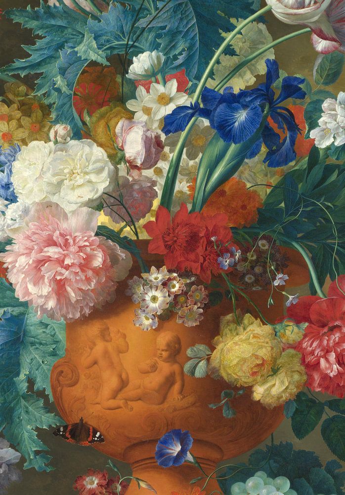 The arrangement includes peonies, poppies, blue iris, African marigolds, apple blossom, narcissi, tulips, hyacinths, roses, ranunculi and auriculas, carnations, convolvulus, grapes, peaches and a chaffinch’s nest, in or around a terracotta vase with a relief of putti playing. The unusual shape of the canvas and the perspective of the marble base suggest that it was made to decorate a particular interior space and hung high. It is dated twice, which might indicate the length of time or the different seasons that van Huysum spent working on it.