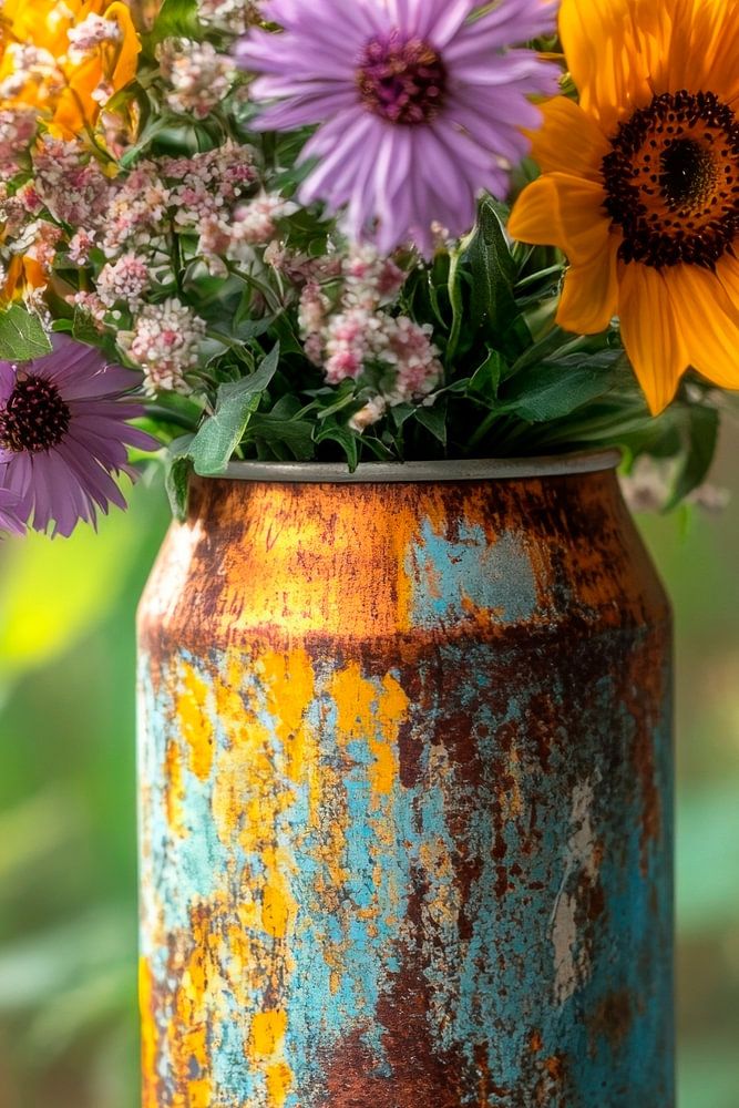 A radiant interplay of sunflowers, delicate lilies and purple flowers is presented in a rustic, patinated glass container that tells stories of days gone by. This colourful composition brings vibrancy to any living room and conjures up summery freshness in your home. A real eye-catcher for nature lovers!