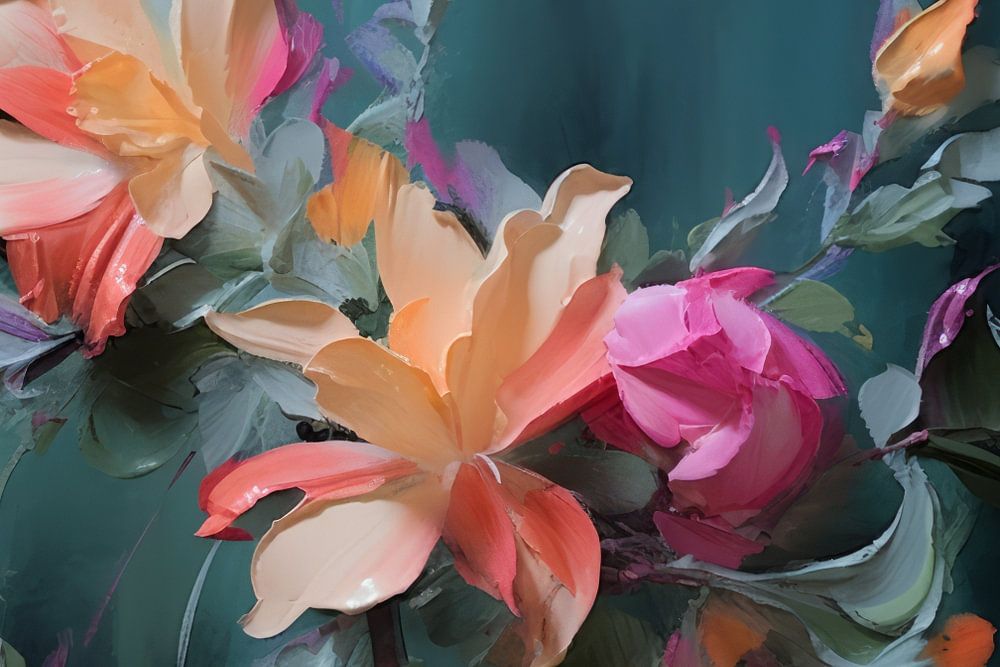 Flowers in bright colours against a green/black background. Beautiful bright colours, carefully combined with each other make this work a real eye-catcher for your interior.