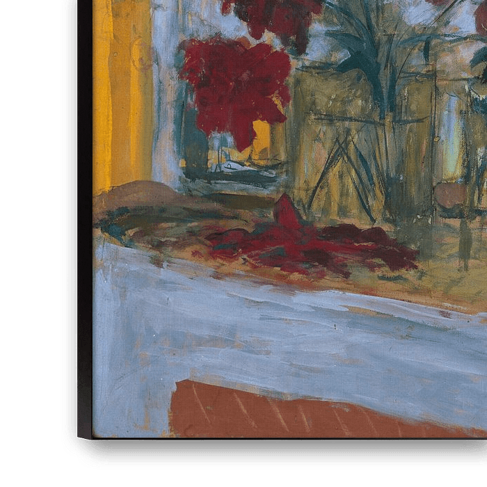 Magnificent peonies, at the point of wilting, have been arranged on a mantelpiece in front of a mirror. Depicted vividly in a matt paint, their deep red hue draws the eye and contrasts with the pale blue and luminous yellow that dominate the work. Here, Édouard Vuillard has reinterpreted the painted bouquet of flowers freely.
