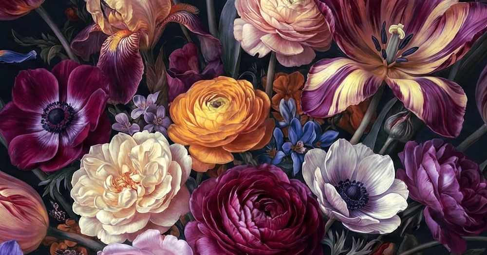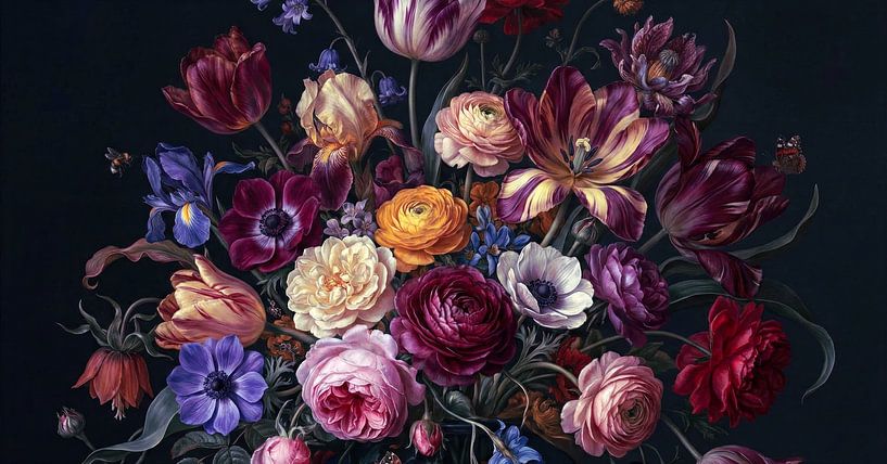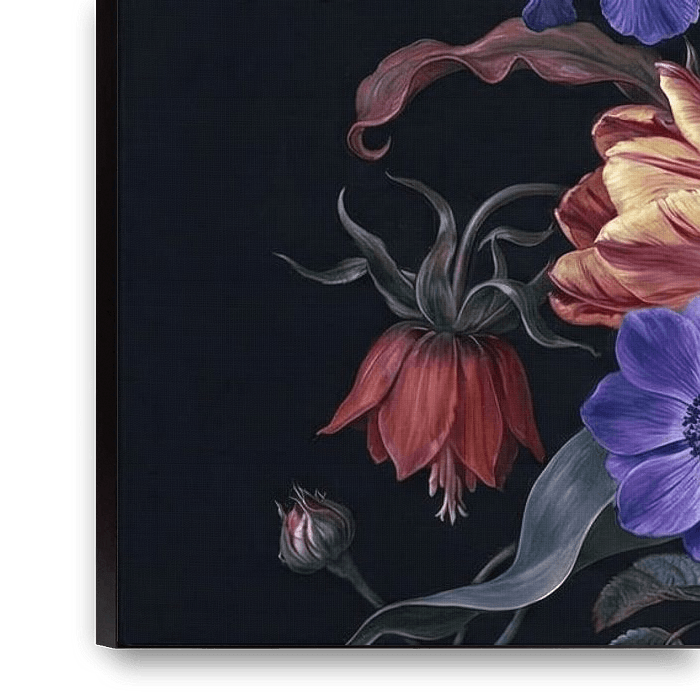 A rich and colourful floral arrangement that stands out beautifully against a dark background. The variety of flowers and shades creates a powerful contrast and gives the artwork an elegant, almost painterly look that adds both warmth and depth to the space.