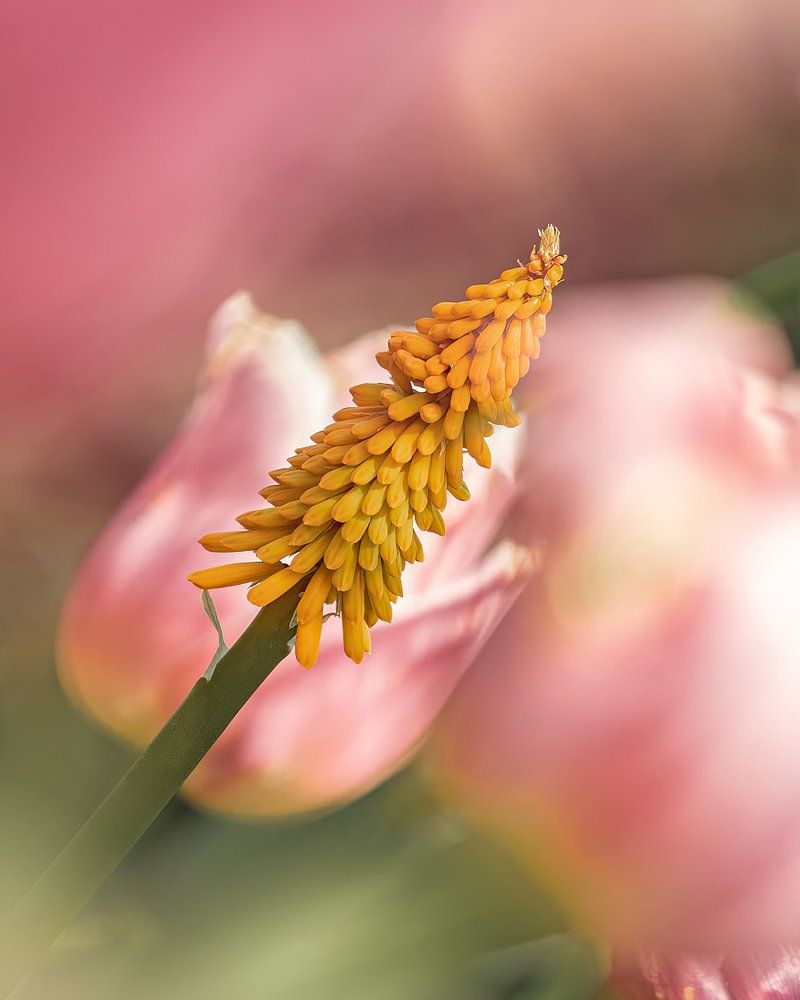 This glimpse gives a cheerful spring feeling. It is bursting with color and softness. This little orange flower grew between the pink tulips and made me happy! I hope you too!
