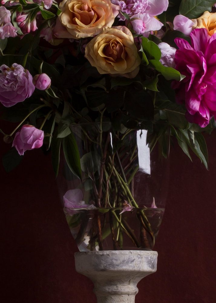 Beautiful atmospheric photography of a colorful bouquet, Roses/Peonies.