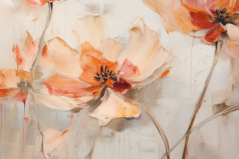 Flowers - This painting radiates with soft brushstrokes representing elegant flowers in a dreamy tone. The colour Peach Fuzz predominates and is complemented by shades of beige, cream and delicate pink accents, creating a warm and inviting atmosphere. The subtle, flowing movement of the petals and the visible texture of the paint create a textural and graceful scene.
